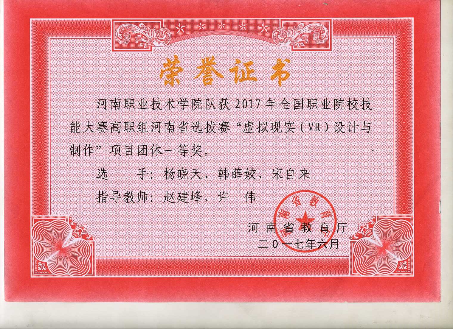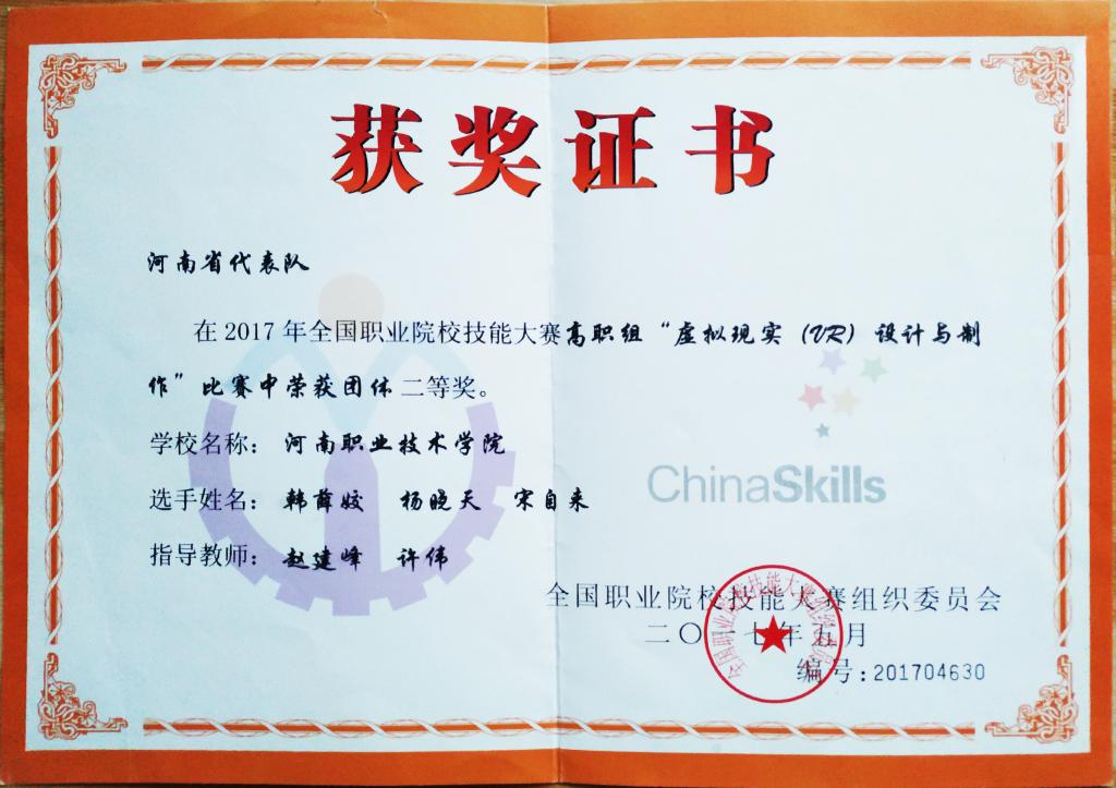 2017年全国职业院校技能大赛高职组虚拟现实(VR)设计与制作赛项河南省一等奖