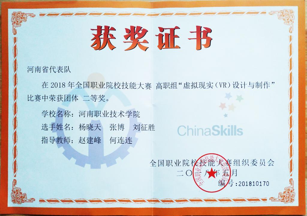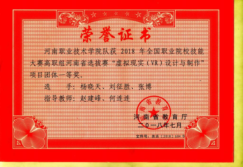 2018年全国职业院校技能大赛高职组虚拟现实(VR)设计与制作赛项河南省一等奖