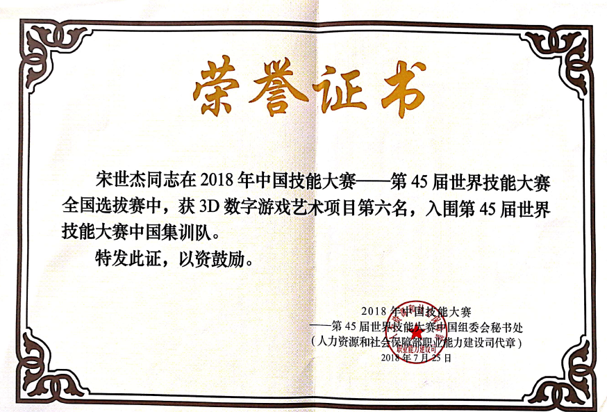 2018年世界技能大赛3D数字游戏艺术项目全国第六名