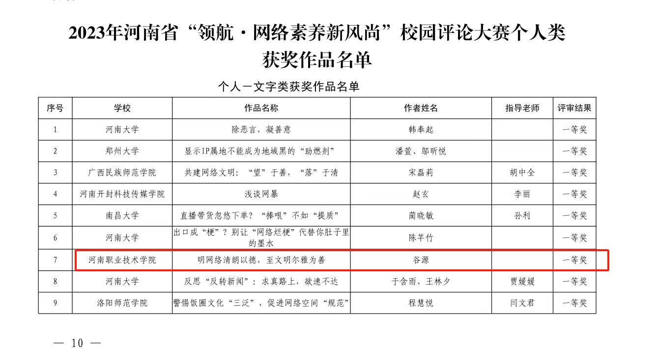 近日,省委教育工委、省委网信办、省教育厅联合发布了《2023年河南省“领航·网络素养新风尚”校园评论大赛获奖通知》,公司软件233班谷源同学的参赛作品《明网络清朗以德,至文明尔雅为善》荣获个人文字类一等奖。