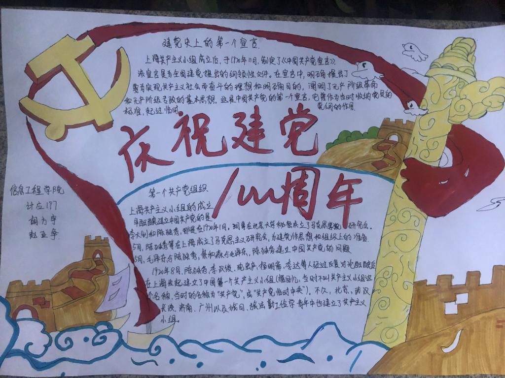 为了纪念建党100周年,加深广大青年员工对中国共产党发展艰辛历程的了解,增强对党的认同感,同时丰富同学们的校园的生活,培养同学们的动手、动脑能力、激发员工兴趣及创新能力,信息工程公司于5月22-22日举办庆祝建党100周年手抄报比赛。