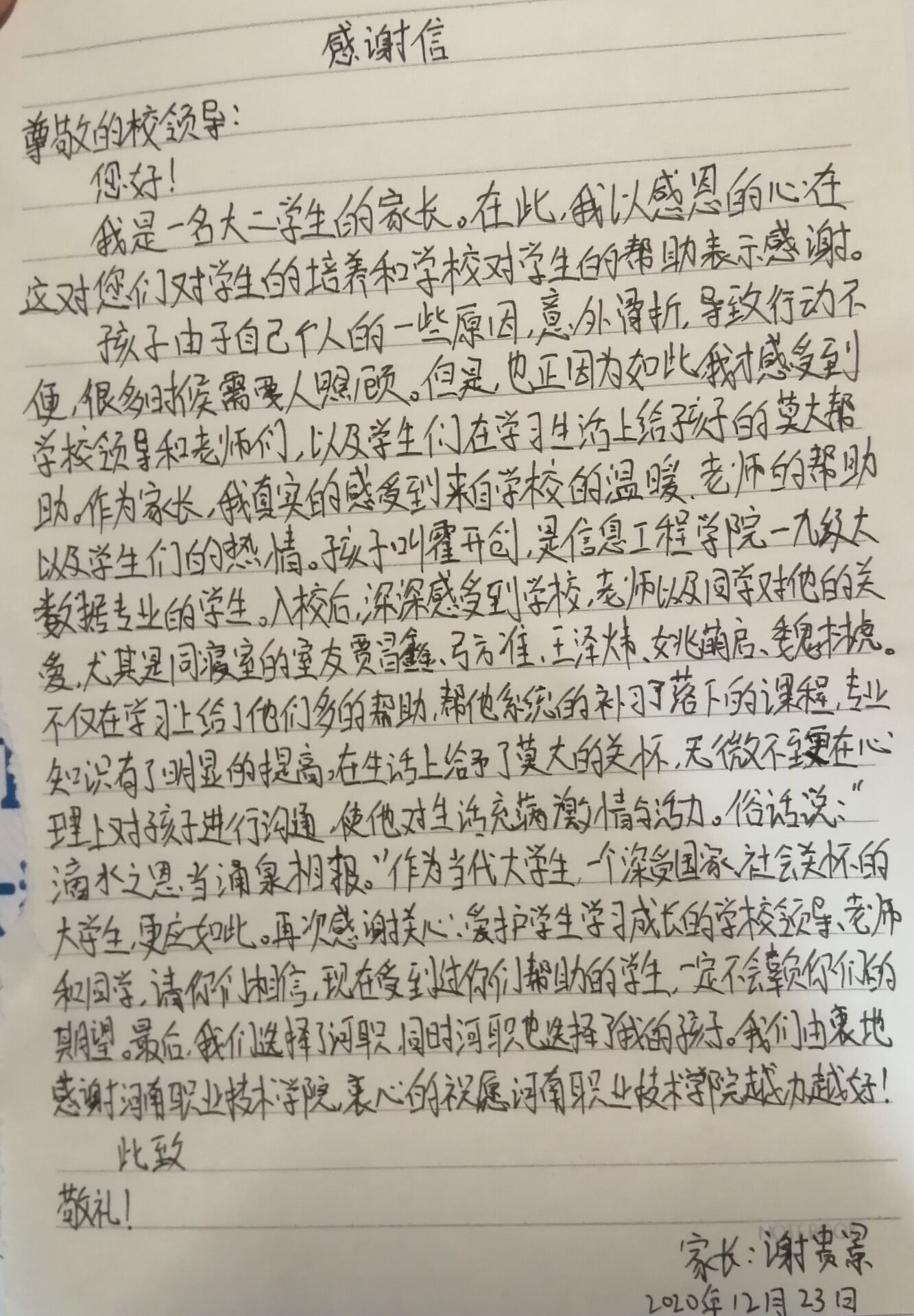 12月23日,信息工程公司19级大数据技术与应用专业的贾昌鑫、弓方准、王泽炜、姚萌启、魏林虎等五名同学收到霍开创同学家长的感谢信。