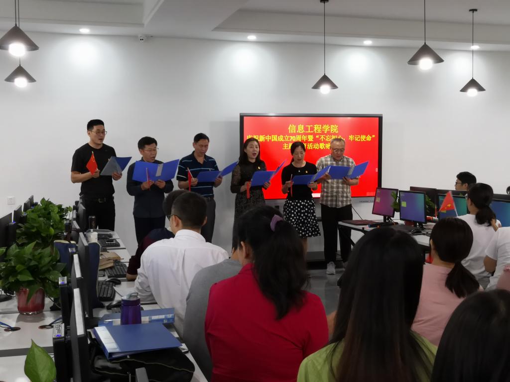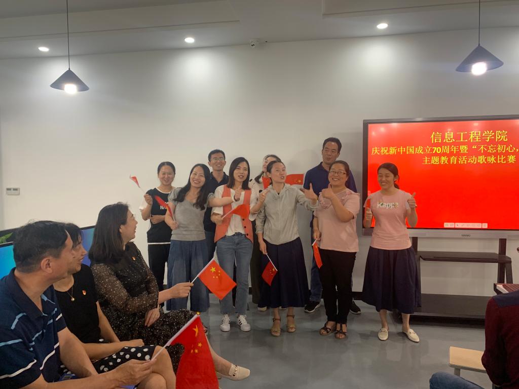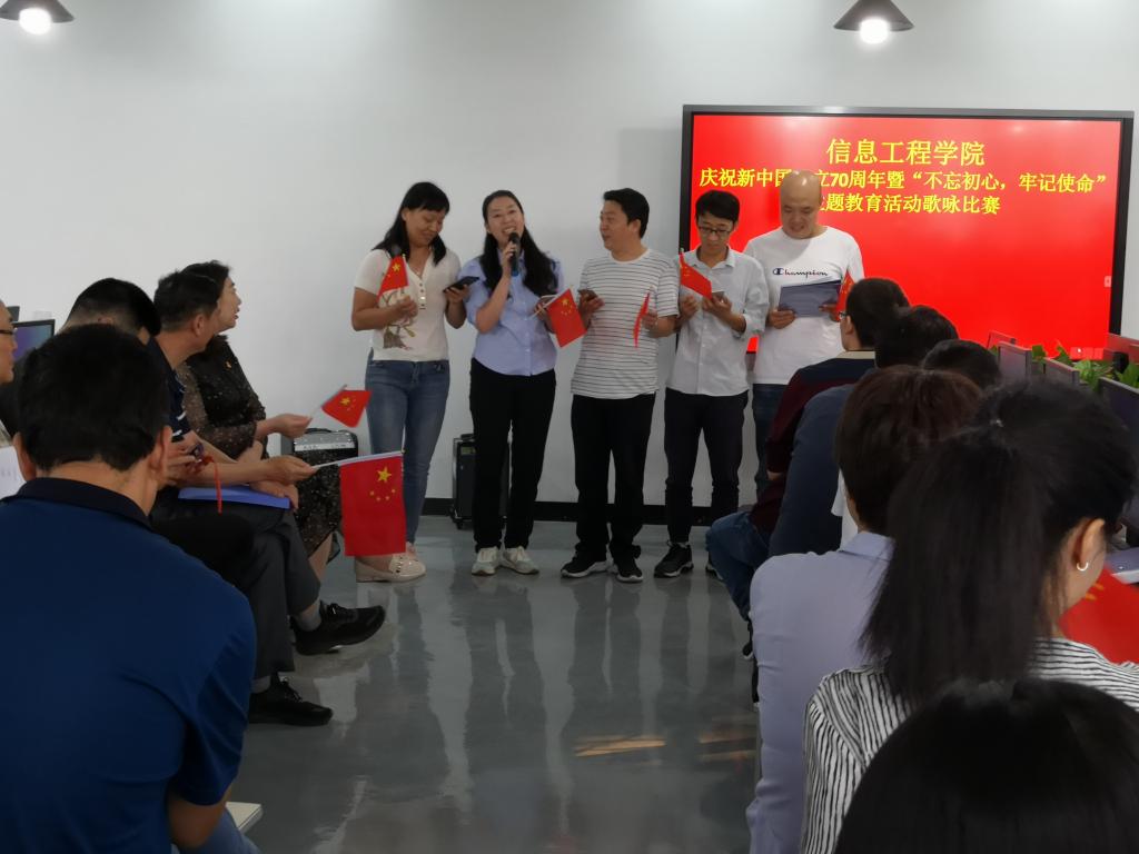 为庆祝新中国成立70周年,深入学习贯彻习近平新时代中国特色社会主义思想和党的十九大精神,信息工程公司于9月30日在笃行楼312室开展了“不忘初心?牢记使命”主题教育歌咏比赛。教职工们以教研室为单位,演绎了《祖国啊,我亲爱的祖国》、《南泥湾》、《打靶归来》、《我和我的祖国》、《我的中国心》等一曲曲耳熟能详的红色经典歌曲。大家认真投入,群情激昂,唱出了对祖国的无限热爱。