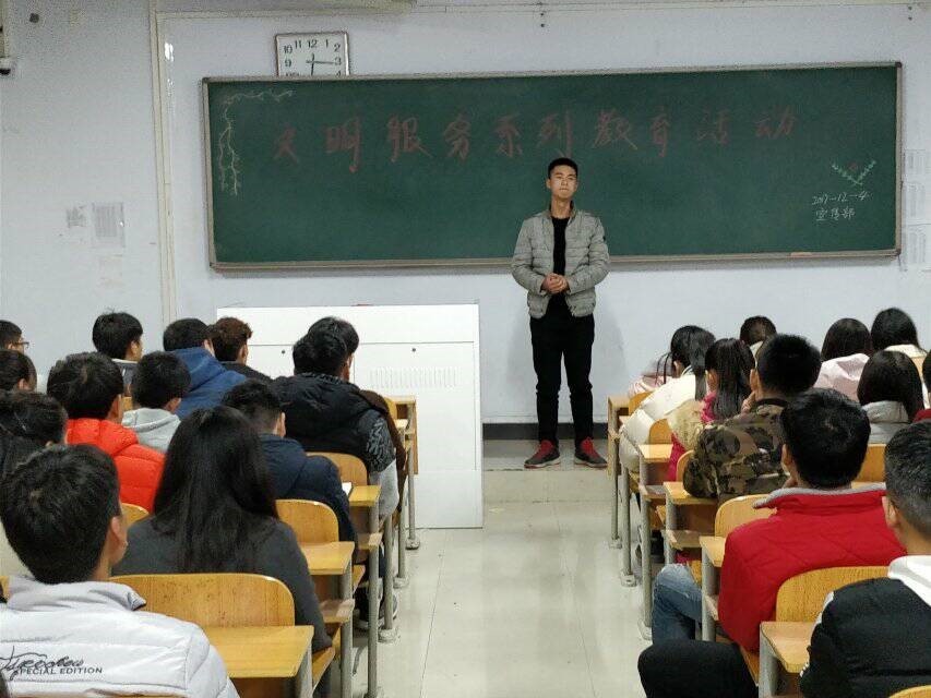 为了加强我系员工干部文明服务,引导我系员工从一言一行做起,规范员工行为,进一步推进全系文明服务和道德风尚教育。12月4日晚信息工程系就业促进会全体成员在3204教室开展了文明服务教育活动。此次活动是我系开展的“六文明”系列教育活动之一。活动以文明服务和行为规范教育为出发点,使信息工程系员工在行为文明、爱护环境、例行节约等方面又迈上了一个新的台阶(供稿:蔡晶晶 审稿:李超林)
