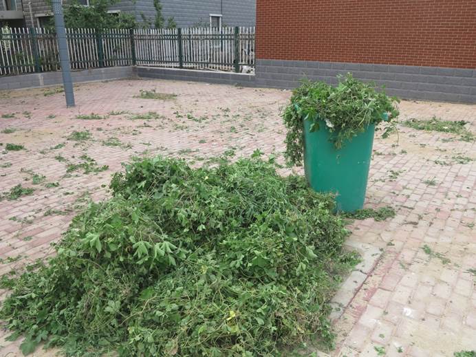 早上六点半,同学们扛着铁锹、推着垃圾桶等劳动工具准时来到“游乐场”集合。同学们合理分工,有的同学用手拔草,有的用铁锹铲锄荆棘,有的整理游乐设施。大家不怕累、不怕脏,虽然汗流浃背,却没有一句怨言。经过近两个小时的劳动,同学们终于将游乐场的杂草清理干净,还老人孩子一个整洁的游乐场所。