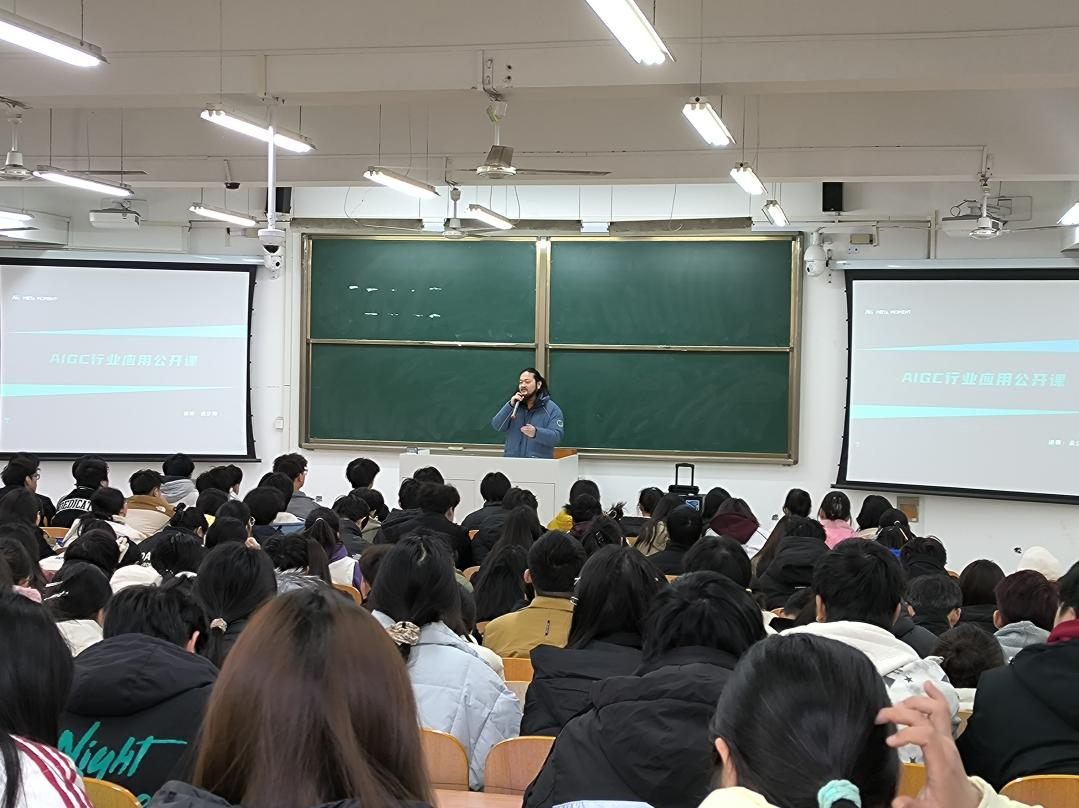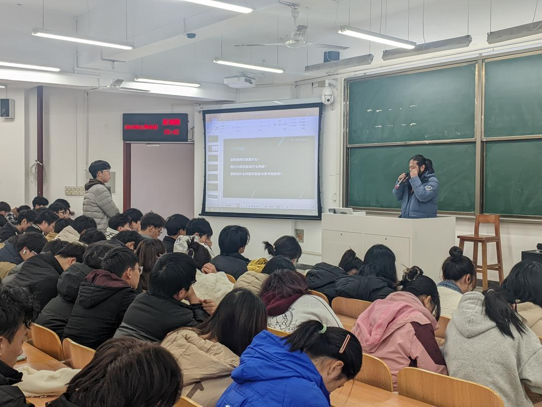 在互动环节,孟夕尧结合自身经验,与同学们积极交流互动,回应了大家对AI技术和职业发展的问题的困惑,他指出面对AI时代的到来,除了持续提升自身的专业技能,还要培养跨学科的知识结构和创新能力。