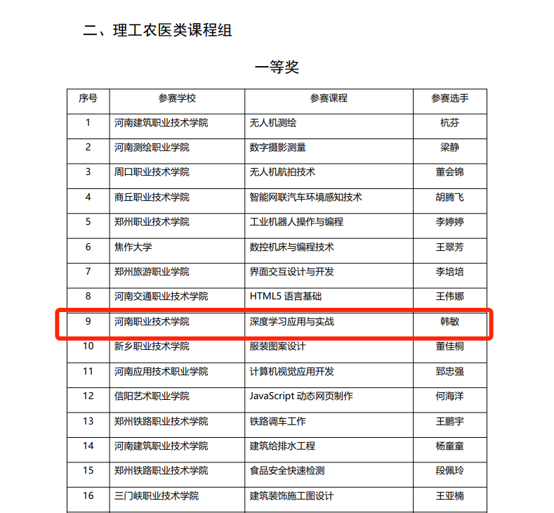 近日,河南省教育厅下发关于2024年河南省高等职业教育课堂教学创新大赛拟获奖名单的公示,公司参赛教师韩敏荣获理工农医类课程组一等奖。