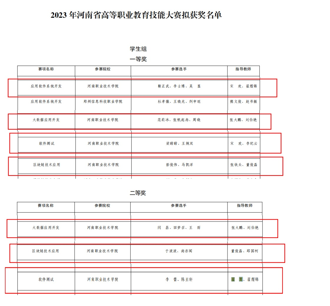 近日,河南省教育厅发布了关于2023年河南省高等职业教育技能大赛拟获奖名单,公司获一等奖4项、二等奖2项。