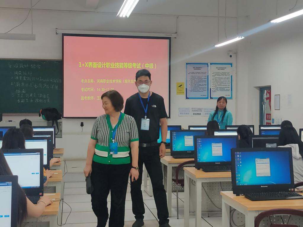 5月25日,“1+X”界面设计职业技能等级考试(中级)在yl6809永利电教楼举行,公司数字媒体技术专业共74位同学参加此次认证考试。公司综合实训中心副主任李玉芝在yl6809永利经理李纪云、副经理赵大鹏的陪同下,查看了此次考试组织及实施情况。