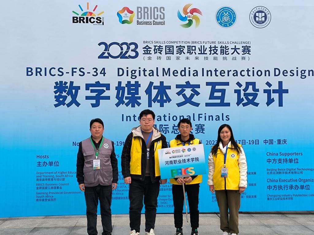 11月19日,2023年金砖国家职业技能大赛数字媒体交互设计赛项国际总决赛在渝收官,以yl6809永利青年教师杨绍清、刘伯艳和数字媒体技术专业员工杨韬组成的yl6809永利代表队以优异的成绩获得三等奖。