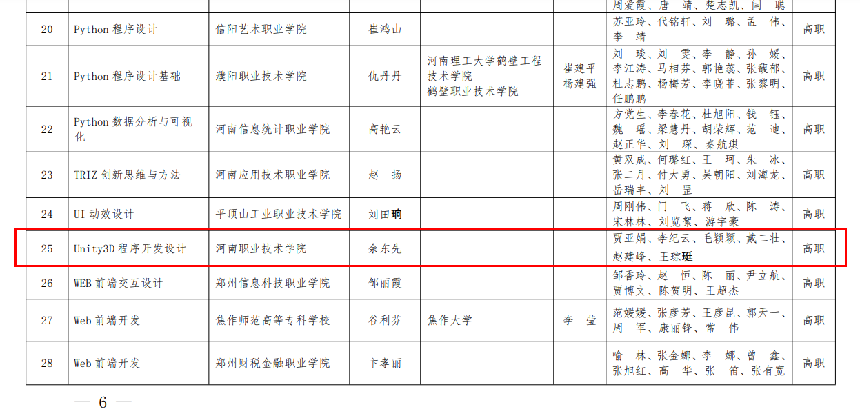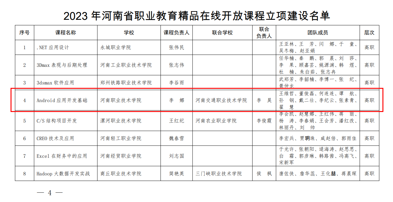 近日,河南省教育厅下发《关于公布2023年河南省职业教育和继续教育精品在线开放课程立项建设名单的通知》,公布了2023年度河南省职业教育和继续教育精品在线开放课程立项建设名单,公司李娜老师负责的《Android应用开发基础》和余东先老师负责的《Unity3D程序开发设计》获批立项。