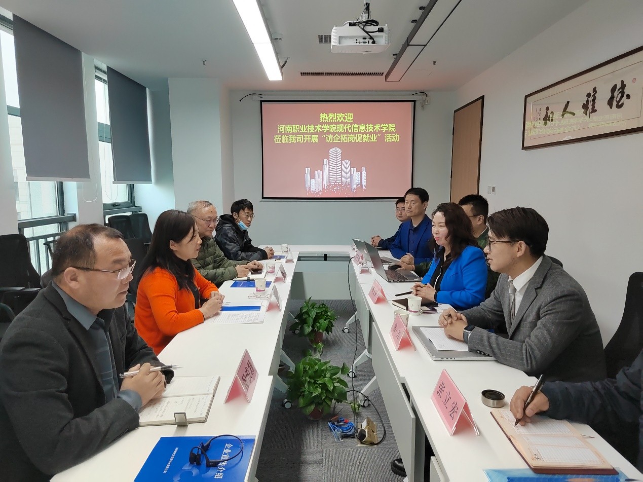 为了认真贯彻落实省委省政府关于加强高校毕业生就业工作的精神和《yl6809永利“访企拓岗促就业”行动实施方案》的要求,为2023届毕业生开拓更多就业创业岗位和机会。3月29日,yl6809永利经理李纪云带领副经理孙杰、董俊磊、专业教师杨绍清一行赴河南博发互联网科技有限公司进行“访企拓岗促就业”交流活动,并与相关企业负责人开展座谈。