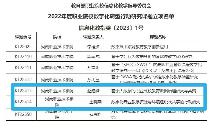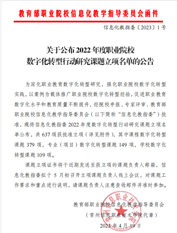 近日,教育部职业院校信息化教学指导委员会印发《关于公布2022年度职业院校数字化转型行动研究课题立项名单的公告》,公布了2022年度职业院校数字化转型行动研究课题立项名单,公司教师王晓燕主持的《数字化专业教学资源与环境建设及共享的行动研究》准予立项。(供稿:王俊平 审稿:孙杰)