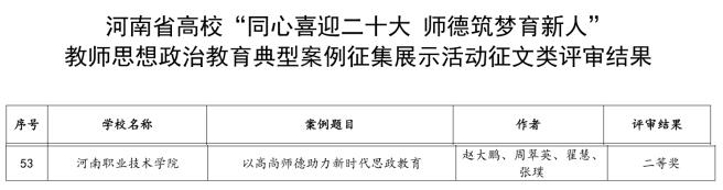 日前,在河南省教育厅举办的高等公司“同心喜迎二十大师德筑梦育新人”教师思想政治教育典型案例征集展示活动中,公司由赵大鹏、周翠英、翟慧、张璞报送的《以高尚师德助力新时代思政教育》征文喜获二等奖。