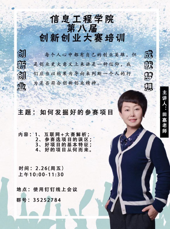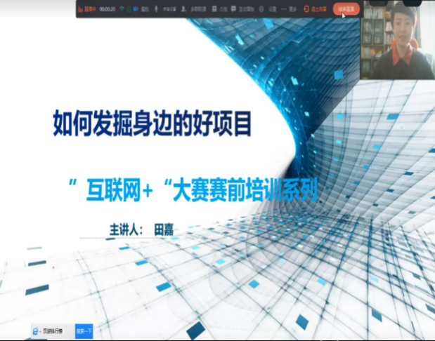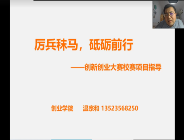 2月24日温宗和老师以《厉兵秣马,砥砺前行》作为主题开展培训,培训会上教授了《创业计划书》书写规范要求、项目筛选、大赛的注意事项并对团队建设进行了指导。2月26日上午田嘉老师以《如何发掘好的参赛项目》为主题,对互联网+大赛进行了解析,并围绕常见参赛选项目的误区、好项目的基本特征、好的项目从何而来等方面做出详细讲解。通过本次线上赛前培训,为创业学子们打开了一座新的大门,使有创新创业意向的同学们对创新创业大赛有了多方面、全方位了解,从而更有针对性地为创新创业大赛做出准备。