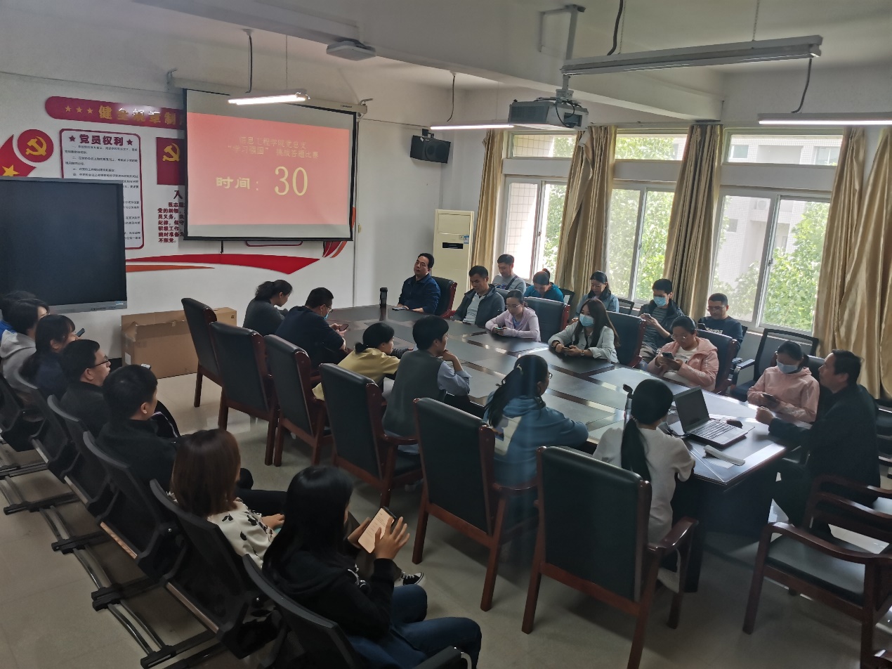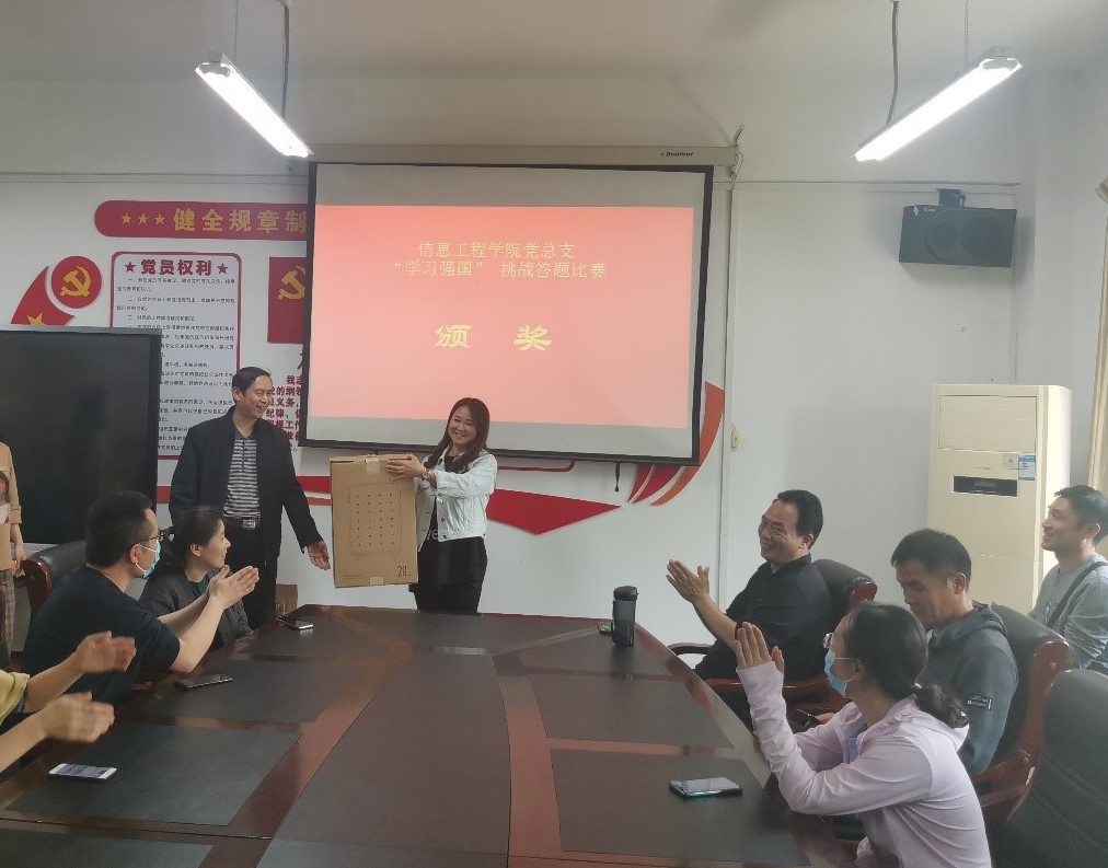 为进一步推进信息工程公司党总支学习型党组织建设,加深全院教师对党的历史、党的知识、党的理论和路线方针的认识,激发爱党爱国热情, 结合公司“学百年党史 汲取奋进力量”主题党日活动,4月29日下午,信息工程公司党支部在党员活动室举行了学习强国挑战答题比赛决赛。参赛选手为各支部自行组织初赛推选出6名优秀选手参与总支决赛。