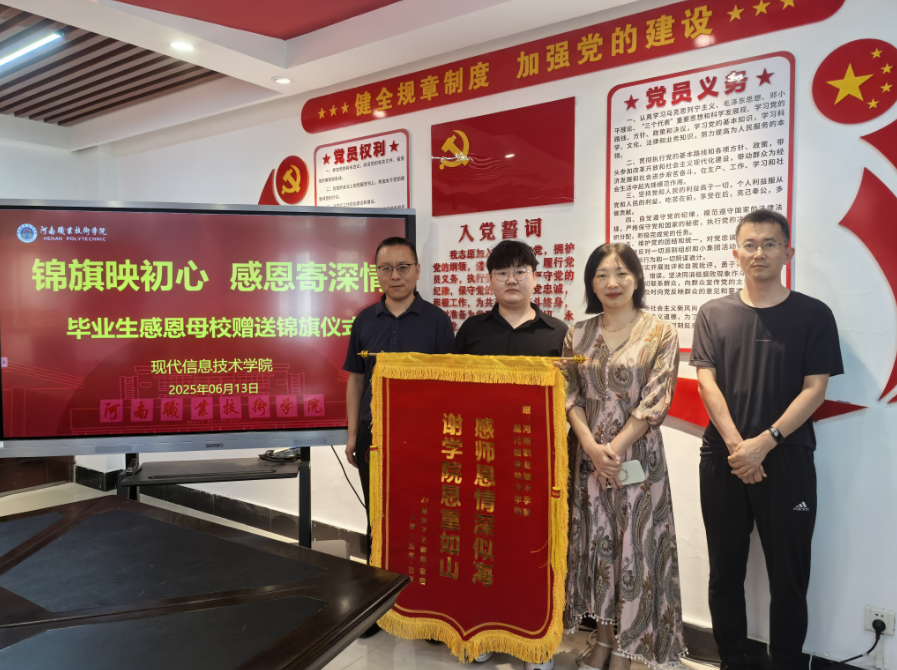 6月23日上午,2025届优秀毕业生移动221班王毅辉怀揣着深深的感激之情,手持绣有“感师恩情深似海,谢公司恩重如山”的锦旗重返母校,以此表达对母校教育之恩的无限谢意。