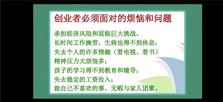 在直播中,学长告诉员工创业是痛并快乐着。为员工讲述了创办企业面临的挑战,好处,以及企业失败的原因。例如创业者必须面临的烦恼和问题有经济风险,精神压力大,长时间工作操劳等等。还有常见的创办企业失败的原因有管理不善,缺乏专门的企业管理知识技能,营业地段差,人气不旺等原因。学长还说创业者要记住一句话,从创业的第一天起,你每天要面对的是困难和失败,而不是成功,我最困难的时候还没有到,但那一天一定回到,困难是不能躲避的,也不能让别人替你去扛,任何苦难都必须你去面对。