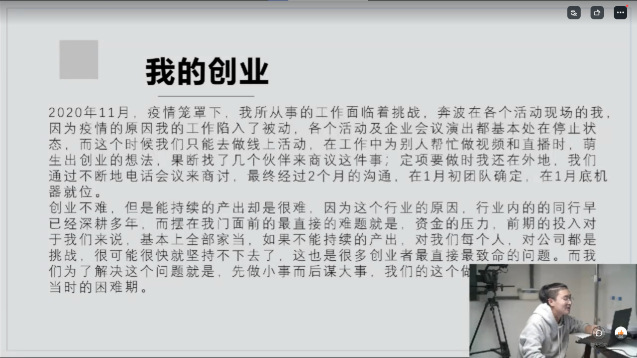 直播过程中,学长告诉员工创业中“吃饭的家伙”必须要趁手、要合适、千万不能去敷衍了事去对付,一旦出问题都是非常大的事故,人员出问题可以理解,设备出一旦出问题,那么你前期的投入甚至于你的团队都将受到否认。也讲述了要找到志趣相投能为之一起奋斗的同事和伙伴,跟同学一起创业也都是对摄影制作非常感兴趣才一起开始做的,如果只是当做赚钱的工具的话,会显得太骨感了,太薄弱,并且坚持的时间不会太长,一定要加入一些自我的价值,才能有更大的动力。
